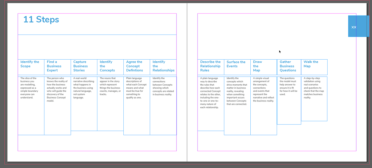 So to test the steps we decided to use the process to “Draw the Map” for an example. As a result of that experimentation it became clear that its easier to teach the step of surfacing the Core Business Events later in the process, Step 8, rather than earlier, i.e Step 4 where we originally had it.